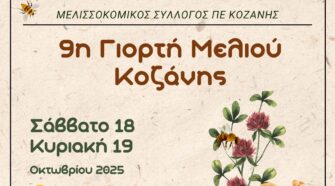 Ο Δήμος Κοζάνης σε συνεργασία με τον Μελισσοκομικό Σύλλογο Π.Ε. Κοζάνης διοργανώνουν την 9η Γιορτή Μελιού Κοζάνης το Σάββατο 18 και την Κυριακή 19 Οκτωβρίου 2025 στην κεντρική πλατεία Κοζάνης. Ώρες : 10:00 π.μ. – 08:00 μ.μ.