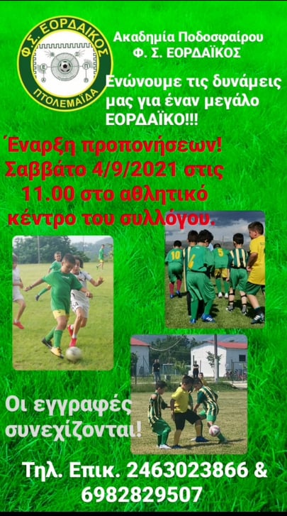 Έναρξη των προπονήσεων για την Ακαδημία ποδοσφαίρου του Φ. Σ. Εορδαϊκού το Σάββατο 4 Σεπτεμβρίου 2021 στις 11:00 στο Αθλητικό κέντρο της ομάδας μας.