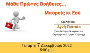 Ομιλήτρια θα είναι η κα. Αγνή Γρατσία, Εκπαιδεύτρια-Νοσηλεύτρια του Ελληνικού Ερυθρού Σταυρού- Περιφερειακό Τμήμα Κοζάνης.
