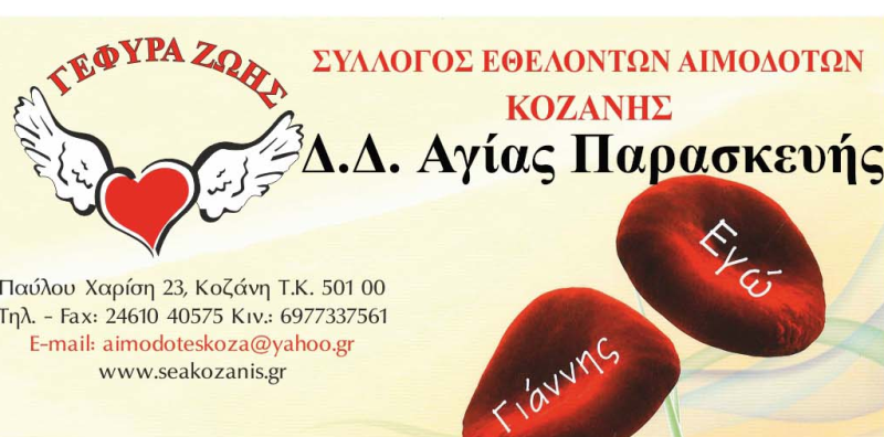 Την Τετάρτη 19 Ιουλίου 2023 και ώρα 15:30 -20:00 ( προσέλευση εως 19:30 ), στο Δημοτικό Σχολείο του Δ.Δ Αγίας Παρασκευής, διοργανώνεται η 23η Αιμοδοσία του ΣΕΑ Κοζάνης με τον Πολιτιστικό Σύλλογο και το Τοπικό Συμβούλιο Αγίας Παρασκευής , σε συνεργασία με το τμήμα Αιμοδοσίας του «Μαμάτσειου» Γενικού Νοσοκομείου Κοζάνης.