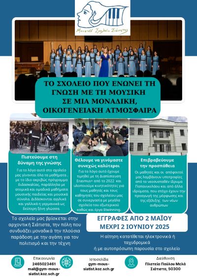 Περισσότερες πληροφορίες στο τηλέφωνο 2465023461 και στα μέιλ mail@gym-mous-siatist.koz.sch.gr ή mousikoscholeiosiatistas@gmail.com