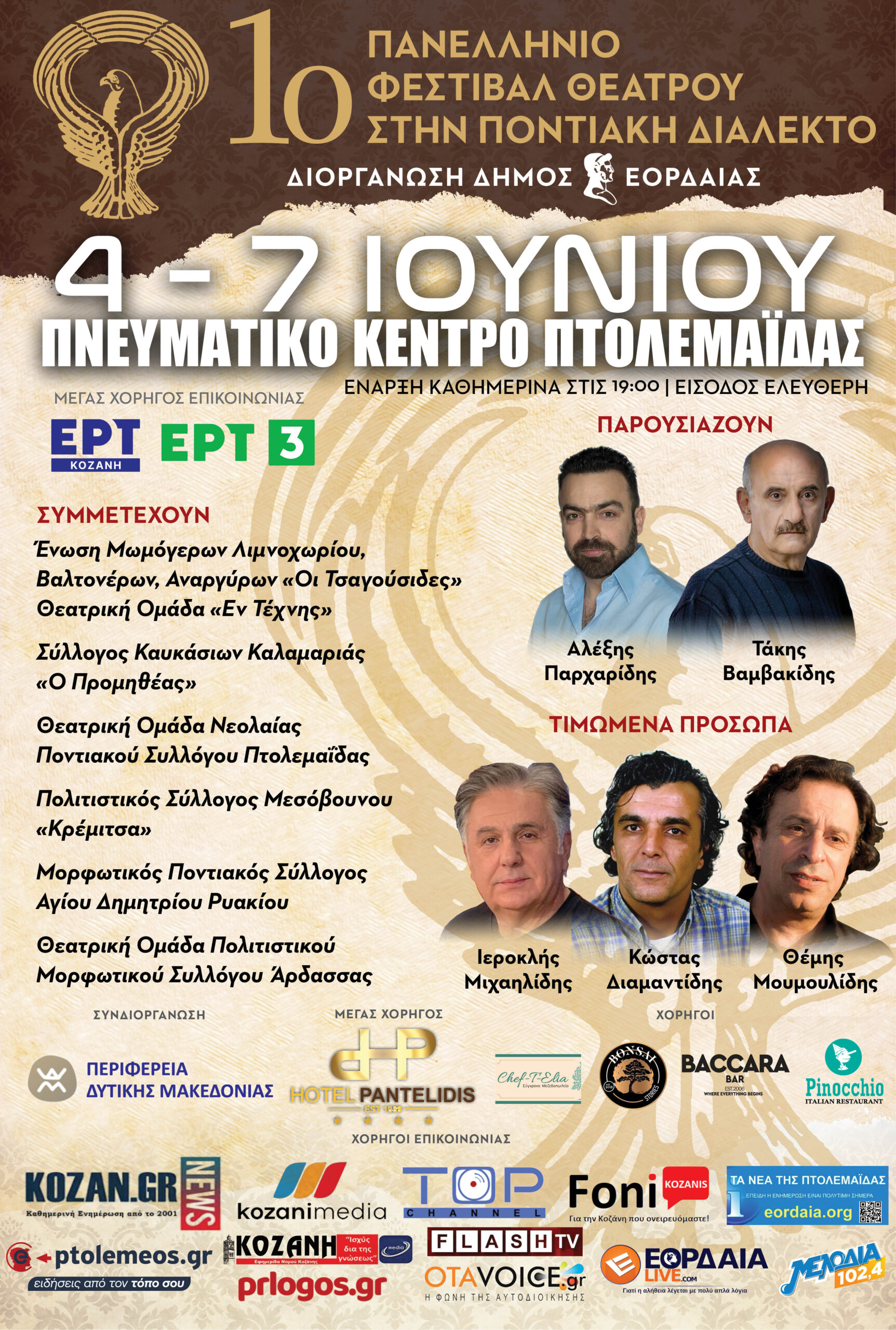 Ο Δήμος Εορδαίας ανακοινώνει τη διοργάνωση του 1ου Πανελλήνιου Φεστιβάλ Θεάτρου στην Ποντιακή Διάλεκτο (Διαγωνιστικού Χαρακτήρα), το οποίο θα πραγματοποιηθεί από τις 4 έως τις 7 Ιουνίου 2025 στο Πνευματικό Κέντρο Πτολεμαΐδας (Περγάμου 80).