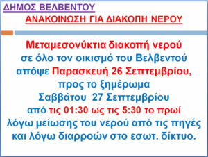 Μεταμεσονύκτια διακοπή νερού σε όλο τον οικισμό του Βελβεντού την Παρασκευή 26 Σεπτεμβρίου προς το ξημέρωμα Σαββάτου 27 Σεπτεμβρίου από τις 01:30 ως τις 5:30 το πρωί λόγω μείωσης του νερού από τις πηγές και λόγω διαρροών στο εσωτερικό δίκτυο.