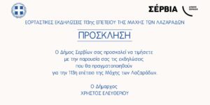 Ο Δήμος Σερβίων σας προσκαλεί να παρευρεθείτε και να τιμήσετε με την παρουσία σας τις εκδηλώσεις που θα πραγματοποιηθούν στις 9 Οκτωβρίου 2025, με αφορμή την 113η Μάχη των Λαζαράδων