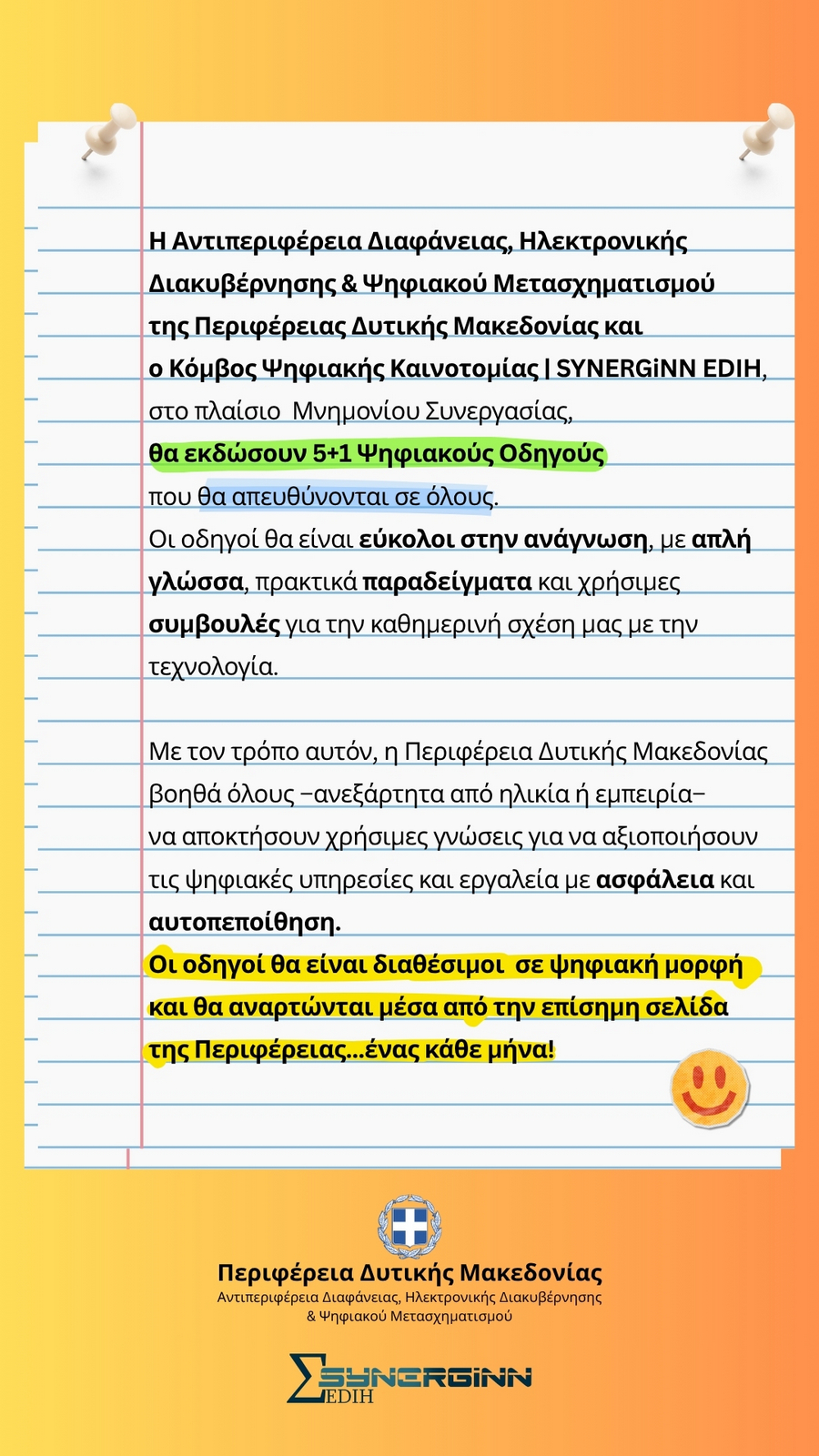 Η Αντιπεριφέρεια Διαφάνειας, Ηλεκτρονικής Διακυβέρνησης & Ψηφιακού Μετασχηματισμού της Περιφέρειας Δυτικής Μακεδονίας και ο Κόμβος Ψηφιακής Καινοτομίας | SYNERGiNN EDIH, στο πλαίσιο Μνημονίου Συνεργασίας, θα εκδώσουν 5+1 Ψηφιακούς Οδηγούς που θα απευθύνονται σε όλους.