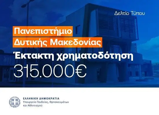 Με απόφαση της Υπουργού Παιδείας, Θρησκευμάτων και Αθλητισμού Σοφίας Ζαχαράκη, δρομολογείται έκτακτη χρηματοδότηση ύψους 315.000 ευρώ προς το Πανεπιστήμιο Δυτικής Μακεδονίας, με στόχο την αποκατάσταση των εκτεταμένων καταστροφών που υπέστησαν πανεπιστημιακές εγκαταστάσεις σε τέσσερις διαφορετικές πόλεις της Περιφέρειας, λόγω των ακραίων καιρικών φαινομένων της 30ής Αυγούστου 2025 και ενόψει της έναρξης του νέου ακαδημαϊκού έτους.