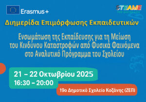 Ο Διευθυντής Πρωτοβάθμιας Εκπαίδευσης Κοζάνης και ο Επόπτης Ποιότητας της Διεύθυνσης Πρωτοβάθμιας Εκπαίδευσης Κοζάνης, σας προσκαλούμε σε διημερίδα επιμόρφωσης εκπαιδευτικών Πρωτοβάθμιας Εκπαίδευσης με θέμα: «Ενσωμάτωση της Εκπαίδευσης για τη Μείωση του Κινδύνου Καταστροφών από Φυσικά Φαινόμενα στο Αναλυτικό Πρόγραμμα της Πρωτοβάθμιας Εκπαίδευσης».