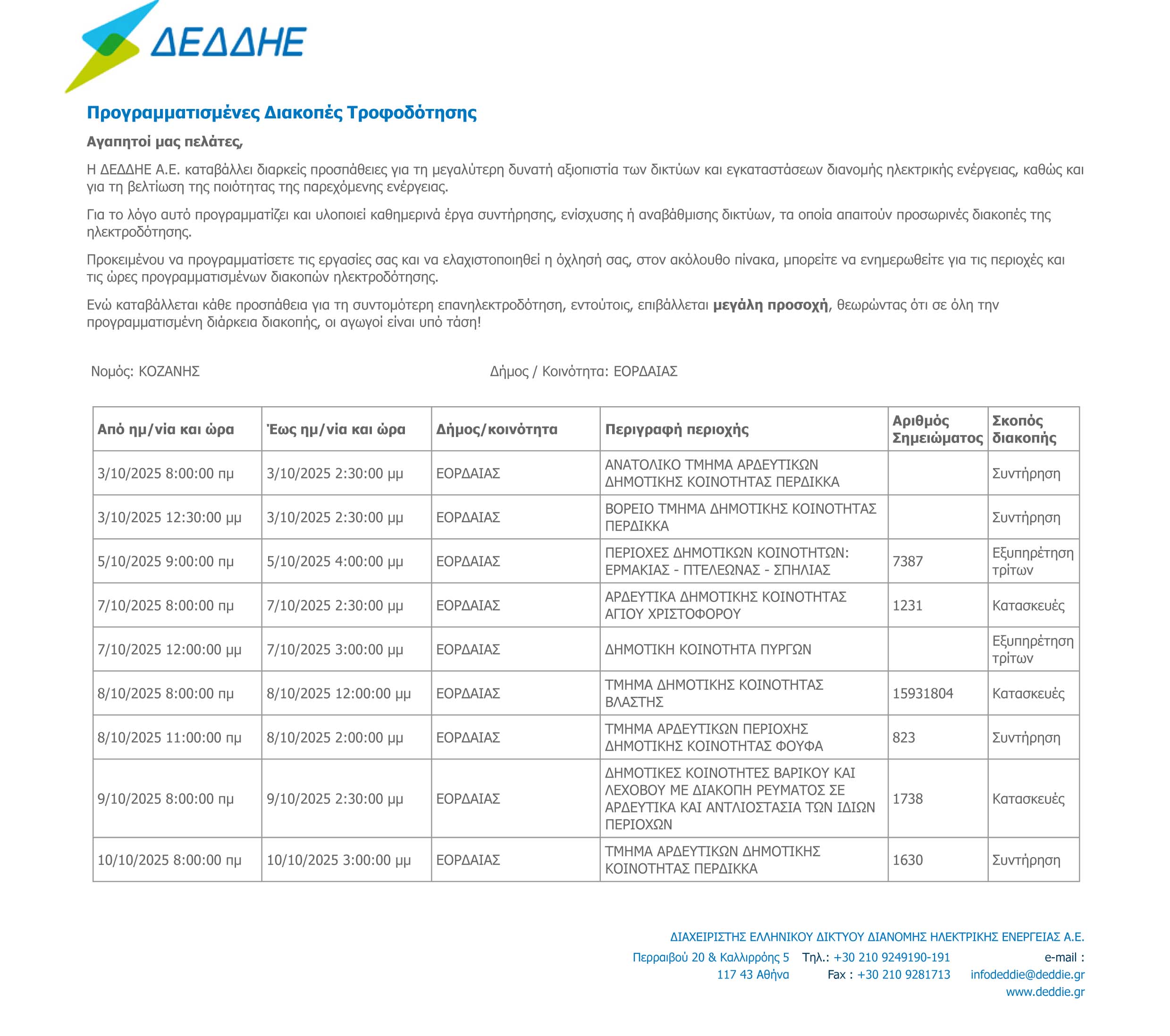 Για το λόγο αυτό προγραμματίζει και υλοποιεί καθημερινά έργα συντήρησης, ενίσχυσης ή αναβάθμισης δικτύων, τα οποία απαιτούν προσωρινές διακοπές της ηλεκτροδότησης.