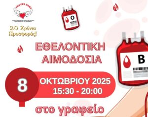 Την Τετάρτη 8 Οκτωβρίου 2025 από τις 15:30–20:00 (προσέλευση μέχρι 19:30) γίνεται αιμοδοσία στο γραφείο (Π. Χαρίση 23) με την συνεργασία της Αιμοδοσίας του Γ.Ν. Κοζάνης.