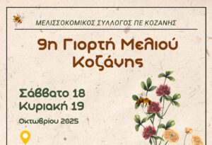 Ο Δήμος Κοζάνης σε συνεργασία με τον Μελισσοκομικό Σύλλογο Π.Ε. Κοζάνης διοργανώνουν την 9η Γιορτή Μελιού Κοζάνης το Σάββατο 18 και την Κυριακή 19 Οκτωβρίου 2025 στην κεντρική πλατεία Κοζάνης.