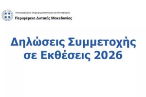 Η Περιφέρεια Δυτικής Μακεδονίας, μέσω του Γραφείου Αντιπεριφερειάρχη Επιχειρηματικότητας και Μεταφορών Νίκου Λυσσαρίδη, στο πλαίσιο προγραμματισμού των πρωτοβουλιών της για την ενίσχυση της επιχειρηματικότητας, της εξωστρέφειας και της ανάπτυξης της τοπικής οικονομίας για το έτος 2026, προσκαλεί τις επιχειρήσεις της περιοχής να δηλώσουν συμμετοχή στις εκθεσιακές δράσεις που θα πραγματοποιηθούν το έτος 2026 στην Ελλάδα και το εξωτερικό.