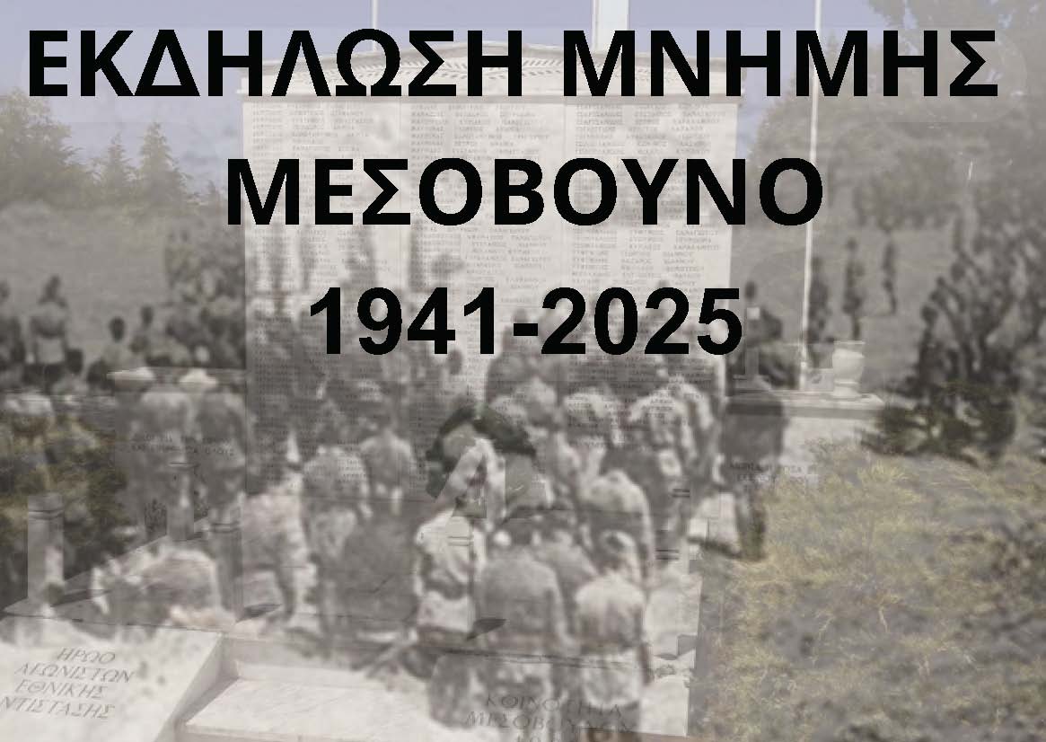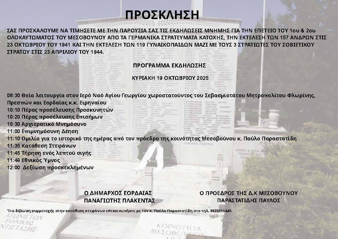 Σας προσκαλούμε να τιμήσετε με την παρουσία σας τις εκδηλώσεις μνήμης για την επέτειο του 1ου & 2ου ολοκαυτώματος του Μεοσβούνου από τα γερμανικά στρατεύματα κατοχής, την εκτέλεση των 157 ανδρών στις 23 Οκτωβρίου του 1941 και την εκτέλεση των 119 γυναικόπαιδων μαζί με τους 3 στρατιώτες του σοβιετικού στρατού στις 23 Απριλίου του 1944.