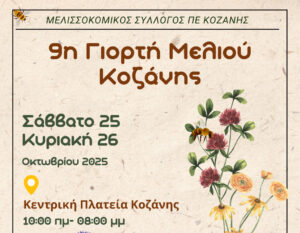 Η προγραμματισμένη 9η Γιορτή Μελιού Κοζάνης αναβάλλεται λόγω δυσμενών καιρικών συνθηκών και μεταφέρεται για το επόμενο Σαββατοκύριακο, 25 και 26 Οκτωβρίου 2025.