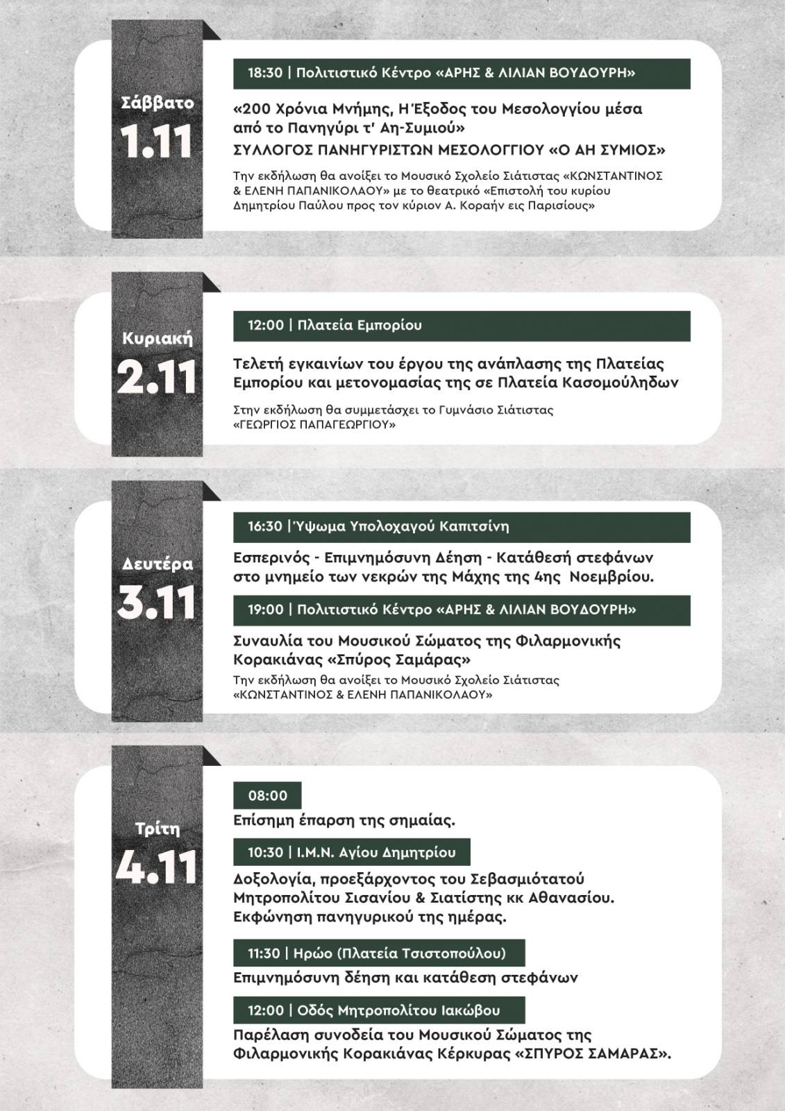 -12:00 Παρέλαση συνοδεία του Μουσικού Σώματος της Φιλαρμονικής Κορακιάνας Κέρκυρας «Σπύρος Σαμαράς». Οδός Μητροπολίτου Ιακώβου