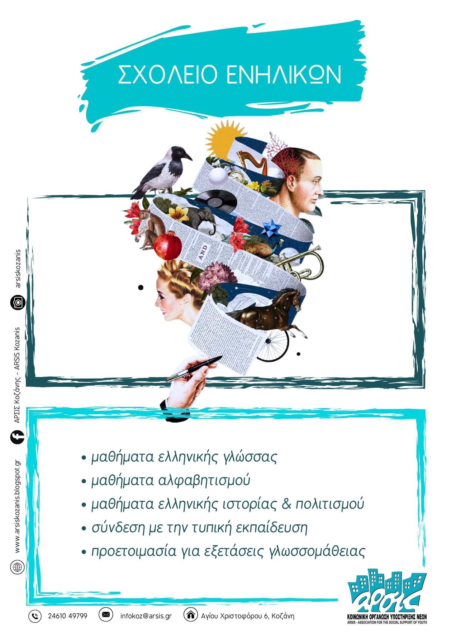 Η ΑΡΣΙΣ Κοζάνης καλεί ενήλικες μετανάστριες/ες, αλλά και Έλληνίδες/ες αναλφάβητες/ους, να εγγραφούν στο Σχολείο Ενηλίκων, το οποίο για ακόμη μία χρονιά προσφέρει δωρεάν μαθήματα ελληνικής γλώσσας, ιστορίας και πολιτισμού.