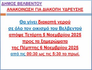 Θα γίνει διακοπή νερού σε όλο τον οικισμό του Βελβεντού την Τετάρτη 5 Νοεμβρίου 2025 προς τα ξημερώματα της Πέμπτης 6 Νοεμβρίου 2025 από τις 00:30 έως τις 5:30 το πρωί.