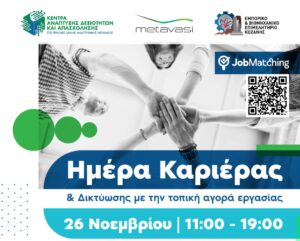 Η Μετάβαση Μ.Α.Ε., σε συνεργασία με το Επιμελητήριο Κοζάνης, διοργανώνουν την Ημέρα Καριέρας & Δικτύωσης με την τοπική αγορά εργασίας, την Τετάρτη 26 Νοεμβρίου 2025, από τις 11:00 έως τις 19:00, στο Εκθεσιακό Κέντρο Δυτικής Μακεδονίας στα Κοίλα Κοζάνης.