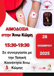 Καλούμε, όλους τους πολίτες του Δ.Δ. ΑΝΩ ΚΩΜΗΣ και της ευρύτερης περιοχής να έρθουν στην εθελοντική ΑΙΜΟΔΟΣΙΑ, να δώσουν Ζωή με το Αίμα τους την Παρασκευή 28 Νοεμβρίου 2025 από τις 15:30 το απόγευμα