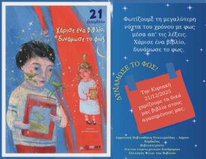 Η Δημοτική Βιβλιοθήκη Πτολεμαΐδας- Δήμου Εορδαΐας, το Βιβλιοτεχνείο, ο Σύλλογος Φίλοι του Βιβλίου και το Δίκτυο Λογοτεχνικών Γραμμών διοργανώνουν την Κυριακή 21 Δεκεμβρίου, από τις 17:00 έως τις 21:00, μια μοναδική, χειμερινή γιορτή ανάγνωσης με τίτλο «Φως μέσα απ’ τις λέξεις» — μια βραδιά αφιερωμένη στη δύναμη της ιστορίας, της φαντασίας και της συλλογικότητας. Η δράση πραγματοποιείται στο πλαίσιο της πανελλήνιας πρωτοβουλίας «Χάρισε ένα βιβλίο, δυνάμωσε το φως», με επίκεντρο τη χαρά της προσφοράς και της ανταλλαγής βιβλίων.