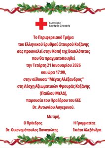 Ο Ελληνικός Ερυθρός Σταυρός διοργανώνει την τελετή κοπής της Πρωτοχρονιάτικης πίτας του Περιφερειακού Τμήματος Κοζάνης, την Τετάρτη, 21 Ιανουαρίου, και ώρα 17:00, στην Αίθουσα “Μέγας Αλέξανδρος”, στη Λέσχη Αξιωματικών Φρουράς Κοζάνης (Παύλου Μελά).
