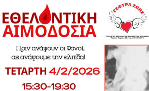 Η εθελοντική αιμοδοσία θα πραγματοποιηθεί την Τετάρτη 4 Φεβρουαρίου 2026, από τις 15:30 έως τις 19:30, στα γραφεία του Συλλόγου, Παύλου Χαρίση 23.