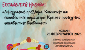 Το Δ.Σ. της Δ.Ο.Ε. σε συνεργασία με τον Σύλλογο Εκπαιδευτικών Π.Ε. Κοζάνης, διοργανώνουν επιστημονική ημερίδα με θέμα: «Δημογραφικό πρόβλημα: Κοινωνικές και εκπαιδευτικές παράμετροι. Κριτικές προσεγγίσεις, εκπαιδευτικές διεκδικήσεις», την Τετάρτη 25 Φεβρουαρίου 2026, ώρα 9.00–15.00 στην αίθουσα συνεδριάσεων Δημοτικού Συμβουλίου Κοζάνης Κοβεντάρειο.