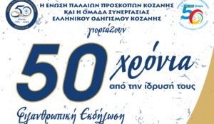Φιλανθρωπική εκδήλωση για τον εορτασμό για τα 50 χρόνια της Ένωσης Παλαιών Προσκόπων Κοζάνης και της Ομάδας Συνεργασίας Ελληνικού Οδηγισμού Κοζάνης, θα πραγματοποιηθεί την Κυριακή 22 Μαρτίου στην Αίθουσα Τέχνης Κοζάνης και ώρα 18:30, με είσοδο ελεύθερη.