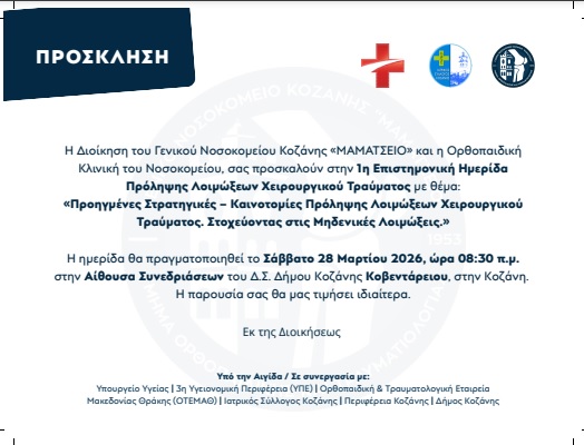 «Προηγμένες Στρατηγικές – Καινοτομίες Πρόληψης Λοιμώξεων Χειρουργικού Τραύματος. Στοχεύοντας στις Μηδενικές Λοιμώξεις.», είναι το θέμα της ενδιαφέρουσας δράσης που θα λάβει χώρα το Σάββατο 28 Μαρτίου 2026 στο Μαμάτσειο Νοσοκομείο Κοζάνης.