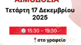Τετάρτη 17 Δεκεμβρίου και ώρες 15:30 – 19:30 στο γραφείο του συλλόγου, αύλου Χαρίση 23, θα πραγματοποιηθεί η τελευταία Εθελοντική Αιμοδοσία για το 2025 Σε αυτές τις γιορτινές ημέρες των Χριστουγέννων, ημέρες αγάπης και αλληλεγγύης, ας αφιερώσουμε μόλις 10 λεπτά για να προσφέρουμε το πιο πολύτιμο δώρο: ζωή. Τις ημέρες των γιορτών οι ανάγκες για …