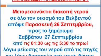 Ανακοίνωση για διακοπή νερού στον οικισμό του Βελβεντού