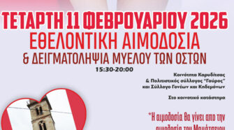 Στην Καρυδίτσα, με τον Πολιτιστικό Συλλόγο “Γαύρος με τον Σύλλογο Γονέων κηδεμόνων του σχολείου μας, και η Κοινότητα μαζί με την Σταγόνα Ελπίδας και την Αιμοδοσία Μαμάτσειου Νοσοκομείου Κοζάνης την Τετάρτη 11 Φεβρουαρίου δίνουμε αίμα, γινόμαστε εθελοντές δότες μυελού οστών την Τετάρτη 11 Φεβρουαρίου στην αίθουσα του πνευματικού κέντρου από 3+30 έως 19+30 ( ώρα …