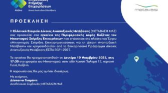 Η Ελληνική Εταιρεία Δίκαιης Αναπτυξιακής ΜετάβΑσης (ΜΕΤΑΒΑΣΗ ΜΑΕ) σας προσκαλεί στα εγκαίνια της Περιφερειακής Δομής Κοζάνης του Μηχανισμού Στήριξης Επιχειρήσεων που εντάσσεται στο πλαίσιο του Έργου «Μηχανισμός Στήριξης Επιχειρηματικότητας για τη Δίκαιη Αναπτυξιακή Μετάβαση» και χρηματοδοτείται από το Επιχειρησιακό Πρόγραμμα Δίκαιης Αναπτυξιακής Μετάβασης ΕΣΠΑ 2021-2027. Τα εγκαίνια θα πραγματοποιηθούν τη Δευτέρα 10 Νοεμβρίου 2025, στις …