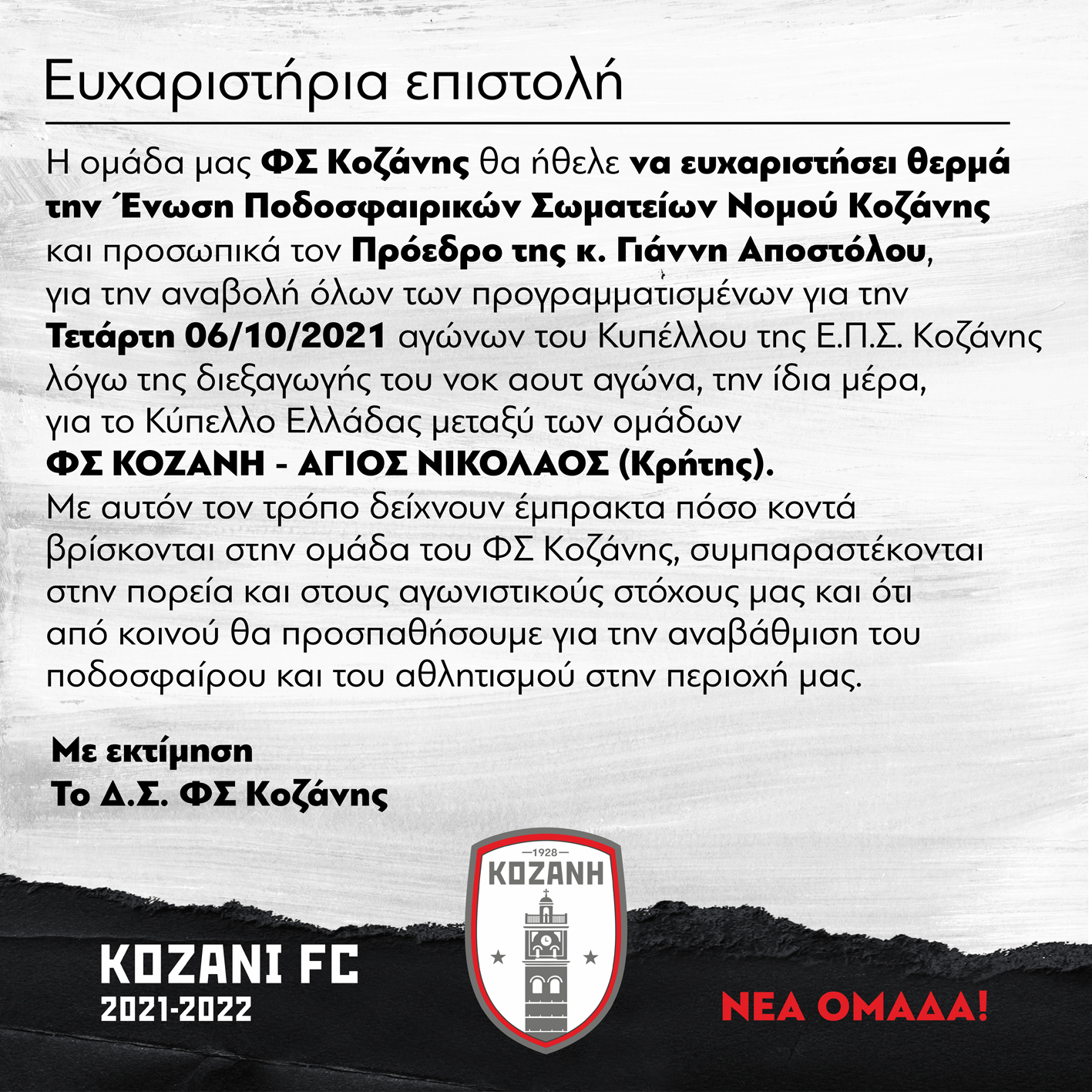 Ευχαριστήριο ΦΣ Κοζάνης