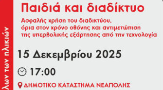 Ημερίδα με θέμα «Παιδιά και Διαδίκτυο: Ασφαλής χρήση του διαδικτύου, όρια στον χρόνο οθόνης και αντιμετώπιση της υπερβολικής εξάρτησης από την τεχνολογία» διοργανώνει ο Δήμος Βοΐου σε συνεργασία με τον Σύλλογο Γονέων και Κηδεμόνων του Δημοτικού Σχολείου Νεάπολης, τη Δευτέρα 15 Δεκεμβρίου, στις 17:00, στο Δημοτικό Κατάστημα Νεάπολης. Πρόκειται για μια πολύ ενδιαφέρουσα ενημερωτική εκδήλωση …