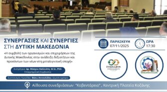 Ο Σύνδεσμος Νέων Καινοτόμων Επιχειρηματιών και Ερευνητών Δυτικής Μακεδονίας (ΣΥΝΚΕΔΥΜ), σε συνεργασία με το Επιμελητήριο Κοζάνης, διοργανώνει την ημερίδα “Συνεργασίες και Συνέργειες στη Δυτική Μακεδονία”, την Παρασκευή 7 Νοεμβρίου 2025, στην αίθουσα Κοβεντάρειο της Κοζάνης, στις 17:30. Εισηγήτρια της εκδήλωσης θα είναι η κ. Καλλιόπη Μόσχου, Επαγγελματική Σύμβουλος, η οποία θα αναπτύξει το θέμα των …