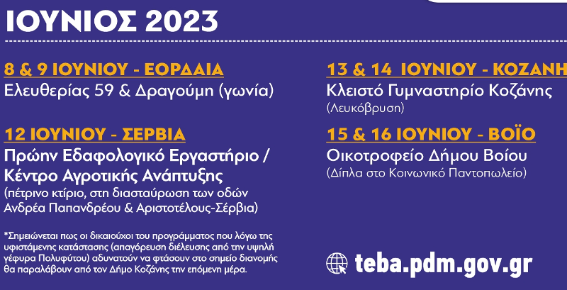 Ο Δήμος Εορδαίας ως κοινωνικός εταίρος της Κοινωνικής Σύμπραξης ΤΕΒΑ Π.Ε. Κοζάνης ανακοινώνει ότι θα πραγματοποιηθεί διανομή τροφίμων του «Επιχειρησιακού Προγράμματος Επισιτιστικής και Βασικής Υλικής Συνδρομής ΤΕΒΑ 2018-2019» στις 08 και 09 Ιουνίου 2023 στην οδό Ελευθερίας 59 και Δραγούμη γωνία από τις 9:00 έως τις 14:00. Οι ωφελούμενοι και οι ωφελούμενες θα ειδοποιηθούν με …