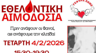 Η εθελοντική αιμοδοσία θα πραγματοποιηθεί την Τετάρτη 4 Φεβρουαρίου 2026, από τις 15:30 έως τις 19:30, στα γραφεία του Συλλόγου, Παύλου Χαρίση 23. Ενόψει της Αποκριάς, είναι ιδιαίτερα σημαντικό να διασφαλίσουμε την επάρκεια αίματος για τους συνανθρώπους μας, στηρίζοντας έμπρακτα το Τμήμα Αιμοδοσίας του Μαμάτσειου Γενικού Νοσοκομείου Κοζάνης. Ο Σύλλογος Εθελοντών Αιμοδοτών Κοζάνης «Γέφυρα Ζωής» …